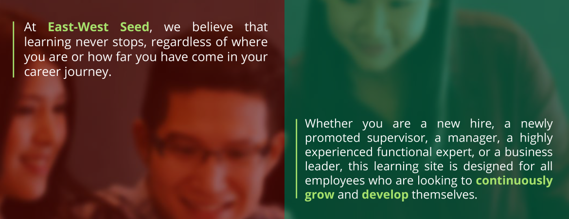 Learning@EWS captures and generates knowledge to develop technical expertise and strengthen leadership capability of our employees who all contribute to improve the lives of our farmers. This platform is the knowledge sharing portal of East-West Seed, a learning management system for learning and training needs.