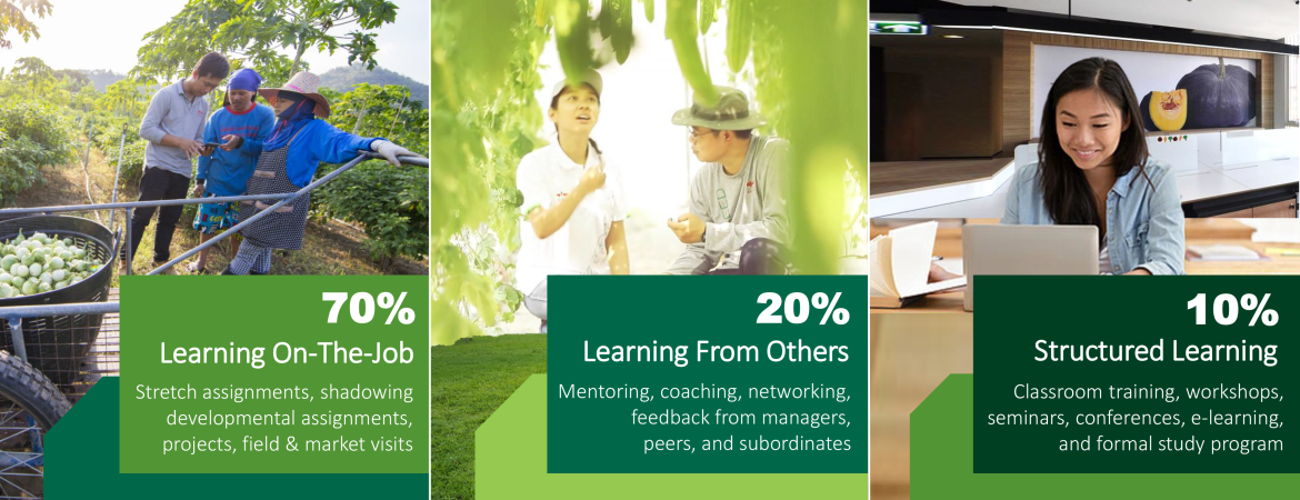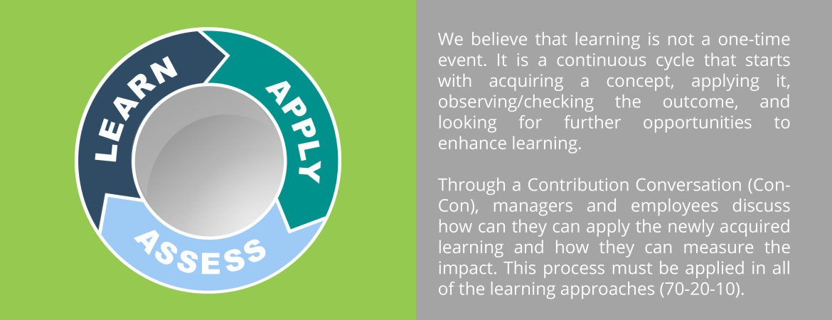 We promote learning and development following the 70-20-10 model. The model is a combination of experiential learning (70), social learning (20), and formal learning (10). Depending on what needs to be learned and the individual’s learning style, managers and employees are encouraged to choose the most appropriate learning approach or a mix of approaches that will deliver effective results within a reasonable period of time.